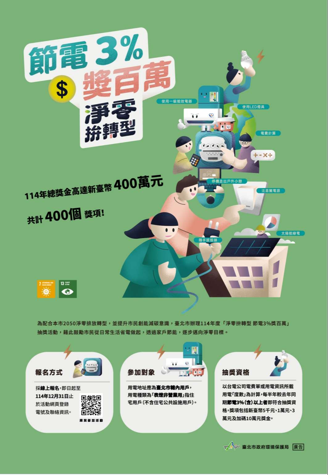 一、為鼓勵市民落實節能減碳行動,臺北市政府環境保護局114年「淨零拚轉型節 電3%獎百萬」抽獎活動(網址:https://energysaving. gov.taipei/),即日起至114年12月31日辦理。