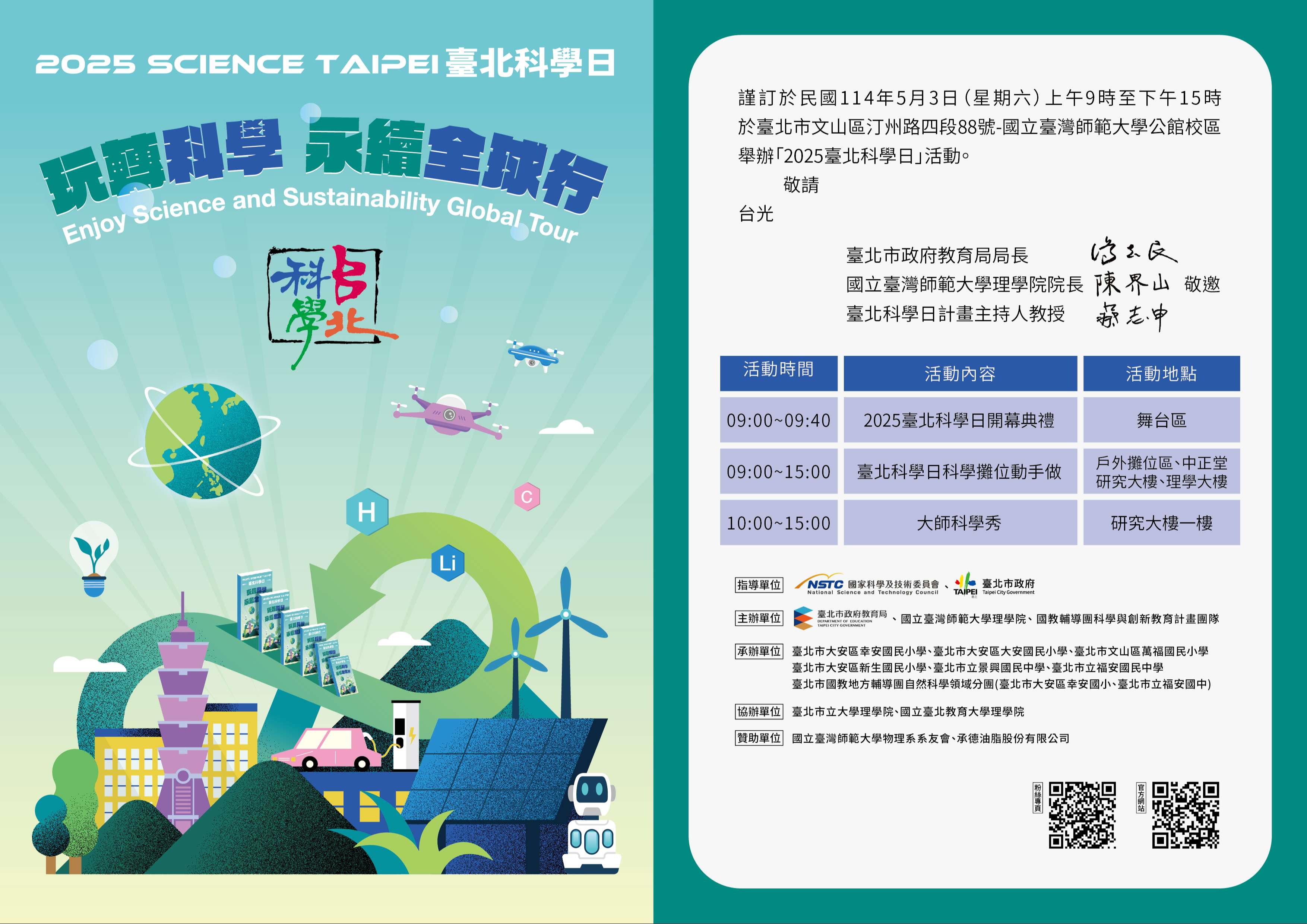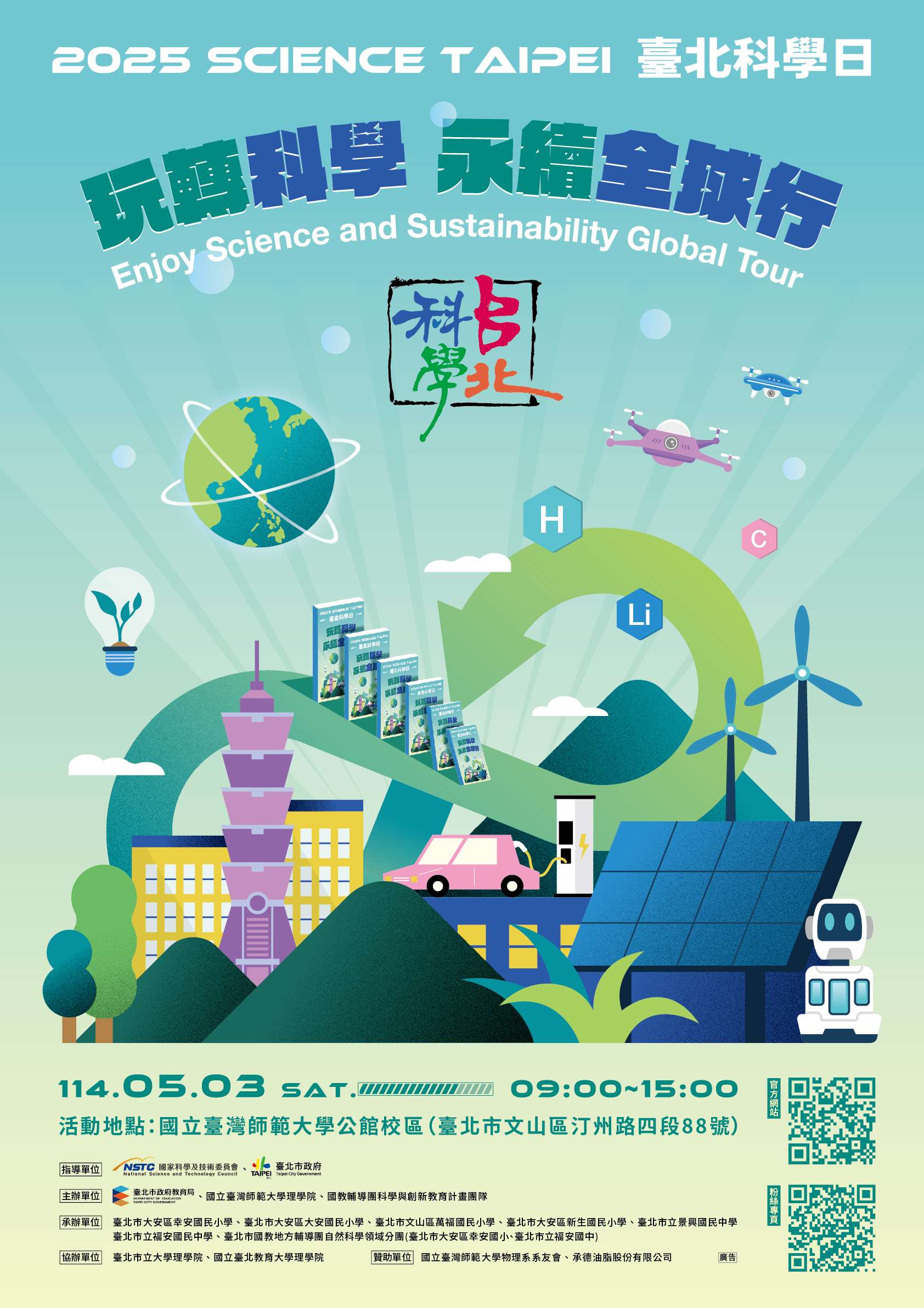 一、旨案係由本局與國立臺灣師範大學理學院物理學系合作舉辦,本年度將於114年5月3日(星期六)假師大公館校區辦理科學體驗實作活動,並響應聯合國教育科學及文化組織「永續發展國際十年(IDSSD)」理念,藉本活動「玩轉科學-永續全球行」之主題,彰顯本市對於推動科學教育的重視。
