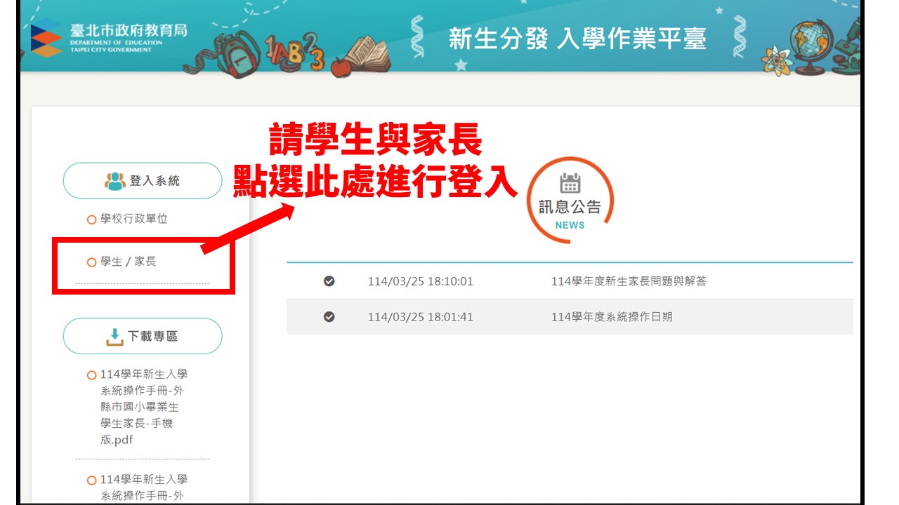 (2) 操作方式:請至本校校網的「新生分發入學作業平臺」完成「網路報到」。新生分發入學作業平台網址如下:https://newstd.tp.edu.tw/Login.action