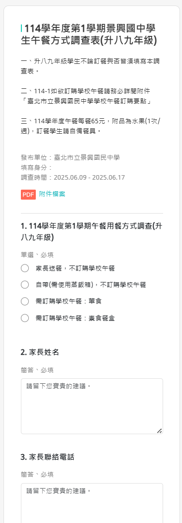2.如需訂購學校午餐,請參閱附件「臺北市立景興國民中學午餐訂購要點」