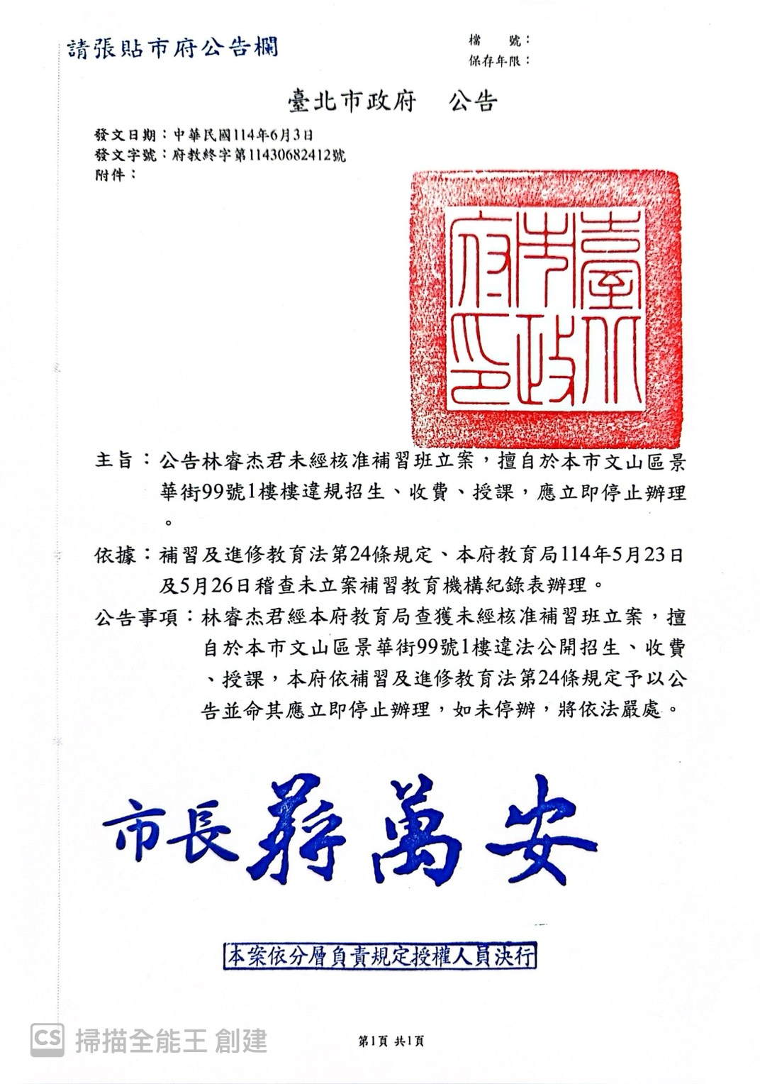 未經核准補習班立案,擅自於本市文山區景華街99號1樓違