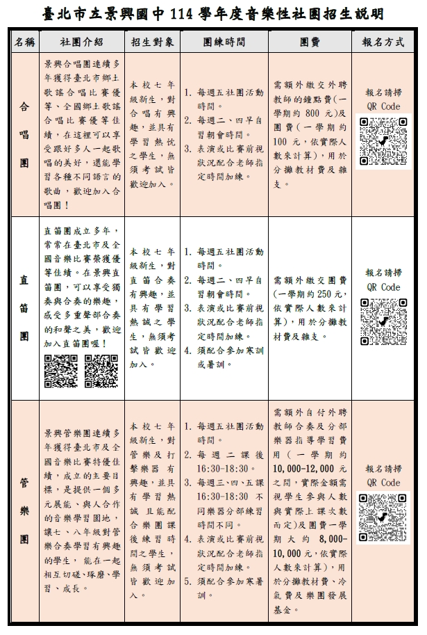 🔴報名前請務必詳閱招生說明內容喔!🎼報名連結(與QR Code相同):👉合唱團 👉直笛團👉管樂團