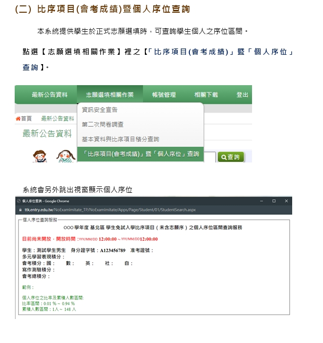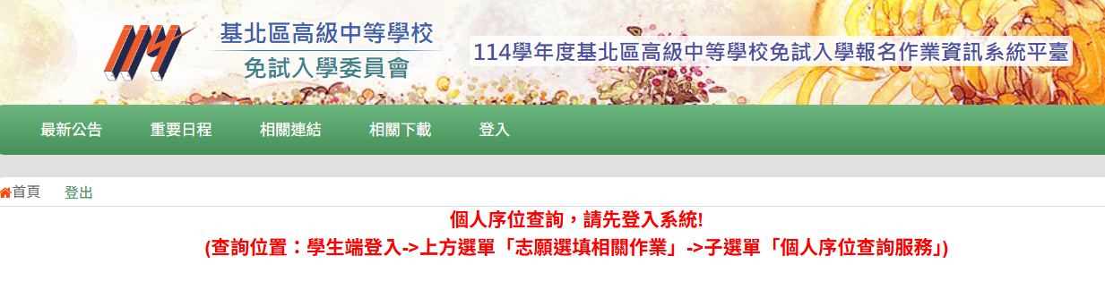 正式志願選填與序位區間查詢6/20(五)中午12時起可查詢序位區間及志願選填,請登入<114學年度基北區免試入學選填網址>https://ttk.entry.edu.tw 進行操作