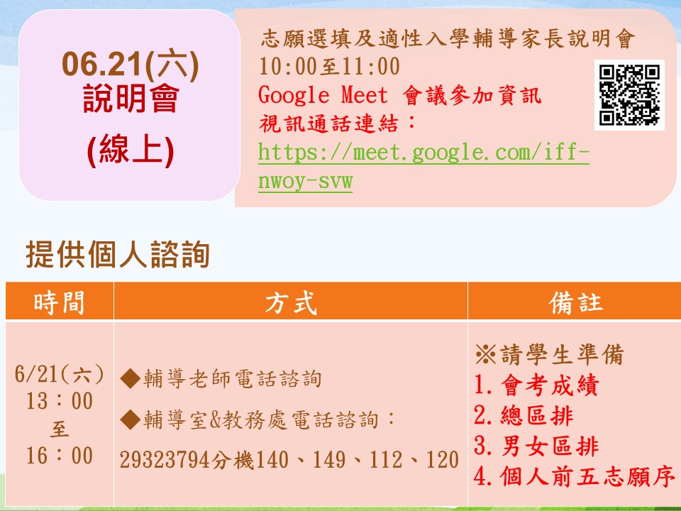 6/21(六)上午10:00 - 11:00-<114年基北區志願選填適性輔導線上說明會>,G