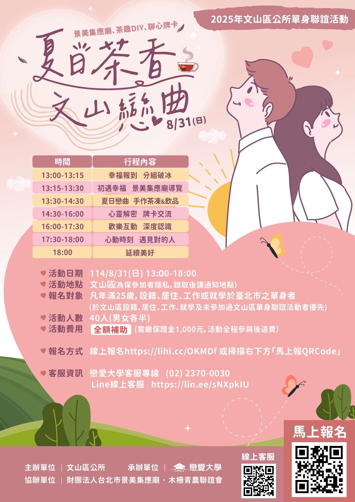 二、臺北市文山區公所114年度單身聯誼活動『夏日茶香.文山戀曲』,將於114年8月31日(星期日)下午1時至