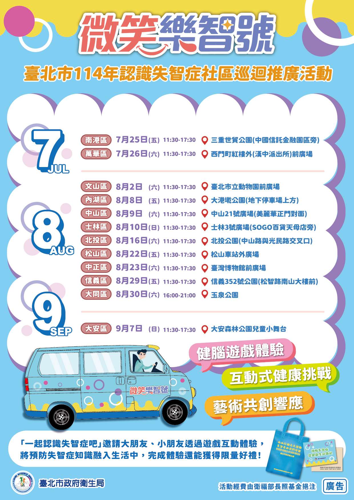 一、為增加民眾對失智症的認識及預防,本局114年結合「微笑樂智號」胖卡車,規劃「健腦遊戲體驗」、「互動式健康 挑戰」、「藝術共創響應」等多元內容,巡迴本市十二行 政區,藉由趣味互動吸引民眾參與,將失智症知識融入生 活中。