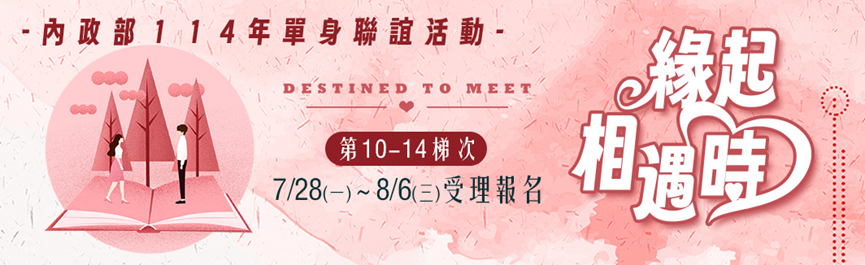 二、內政部114年「緣起相遇時」單身聯誼活動第10-14梯次訂於7月28日至8月6日受理報名,歡迎單身者踴躍報名。活動詳情及報名資訊請參閱內政部戶政司全球資訊網(主題資訊—單身聯誼活動專區)。