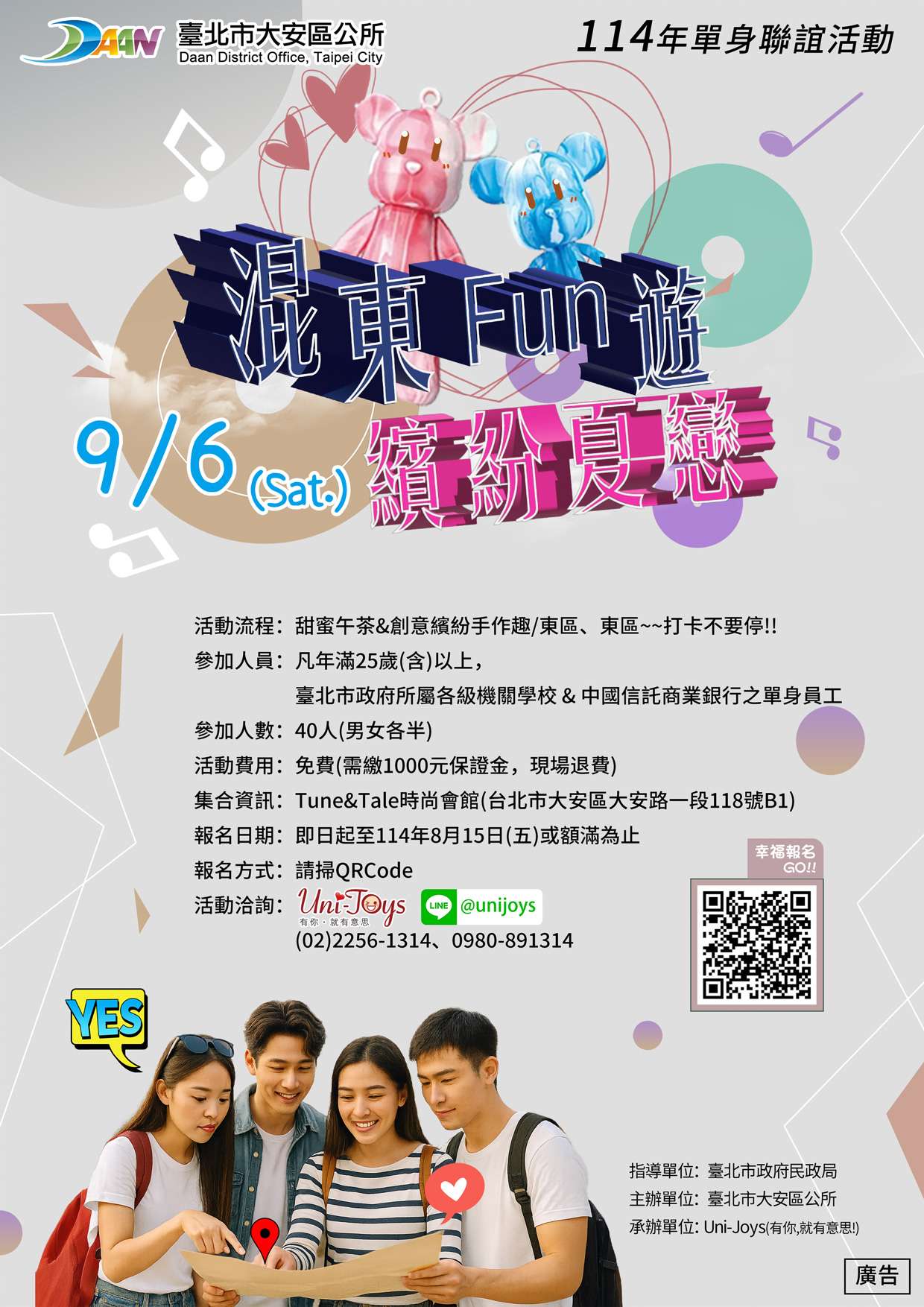 二、旨揭活動訂於114年9月6日(星期六)下午13時至17時30分於Tune&Tale時尚會館(臺北市大安區大安路1段118號地下1樓)及臺北東區商圈舉行,自即日起至114年8月15日(星期五)或額滿為止。
