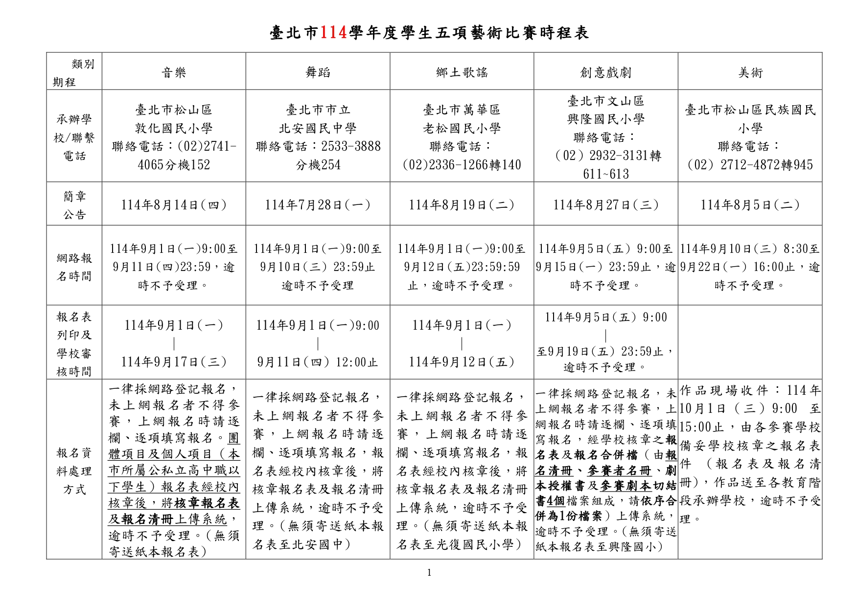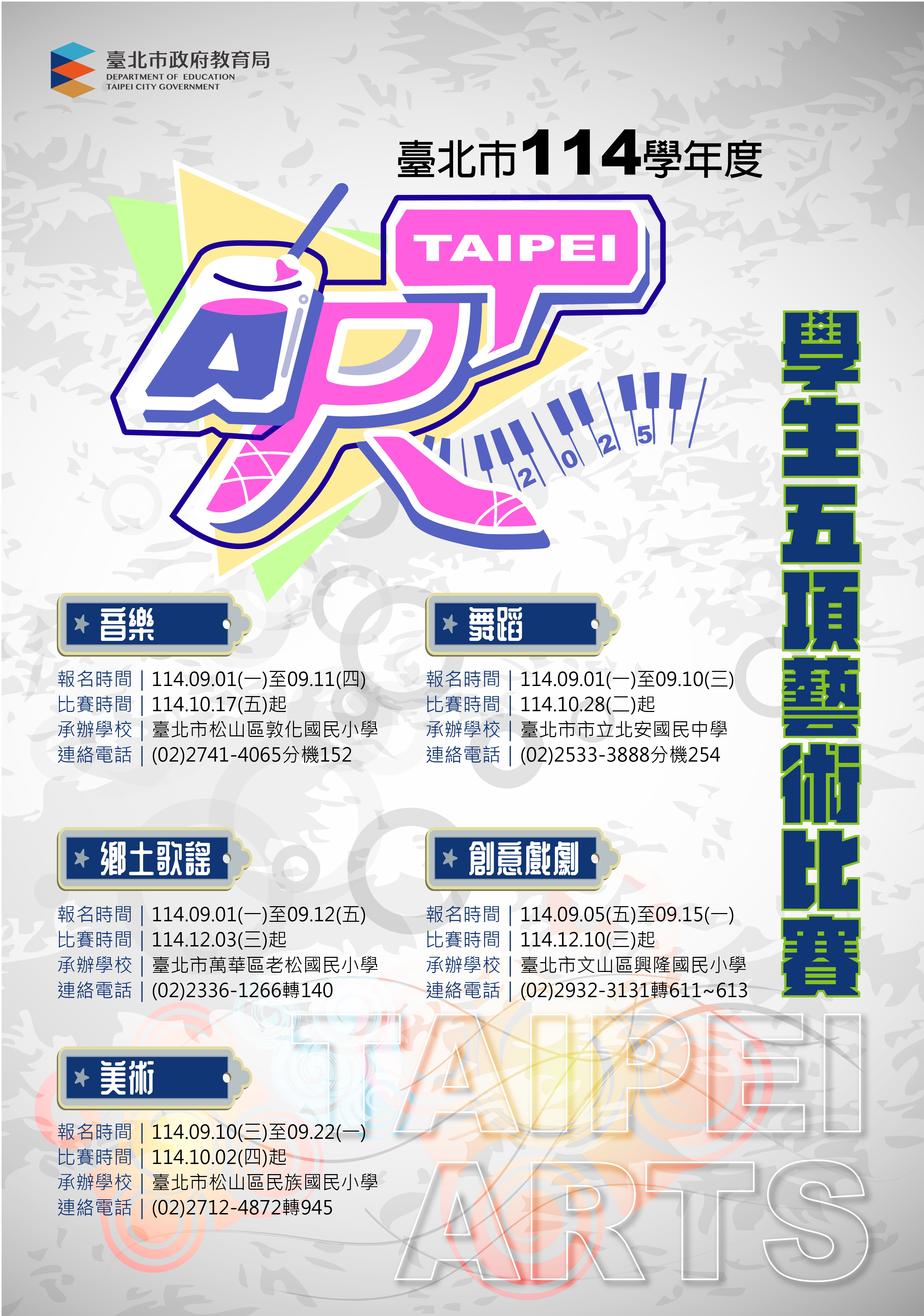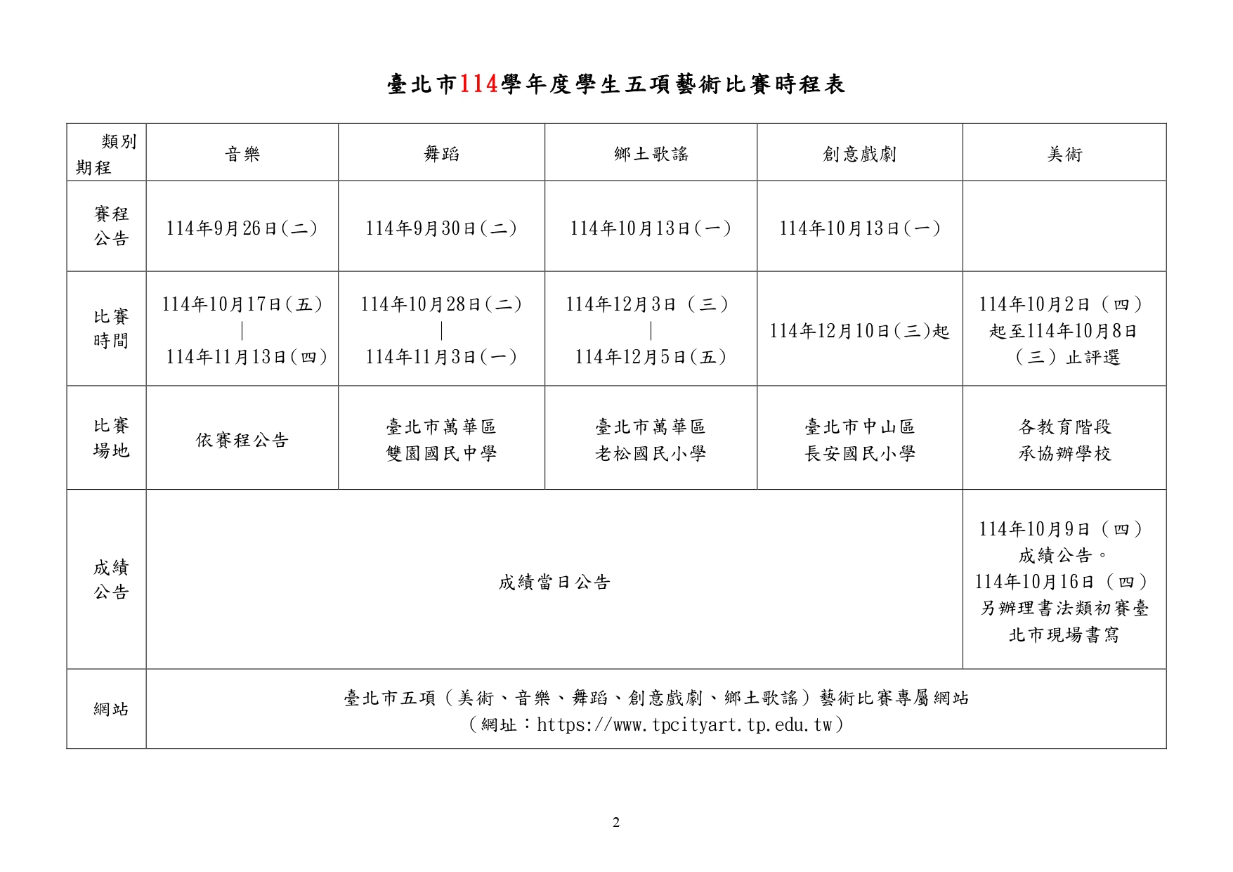 二、本市學生五項藝術比賽自114年9月1日(星期一)起陸續開放網路報名。相關訊息及作業時程,請至臺北市五項藝術比賽網站https://www.tpcityart.tp.edu.tw/查詢,逾期不受理。