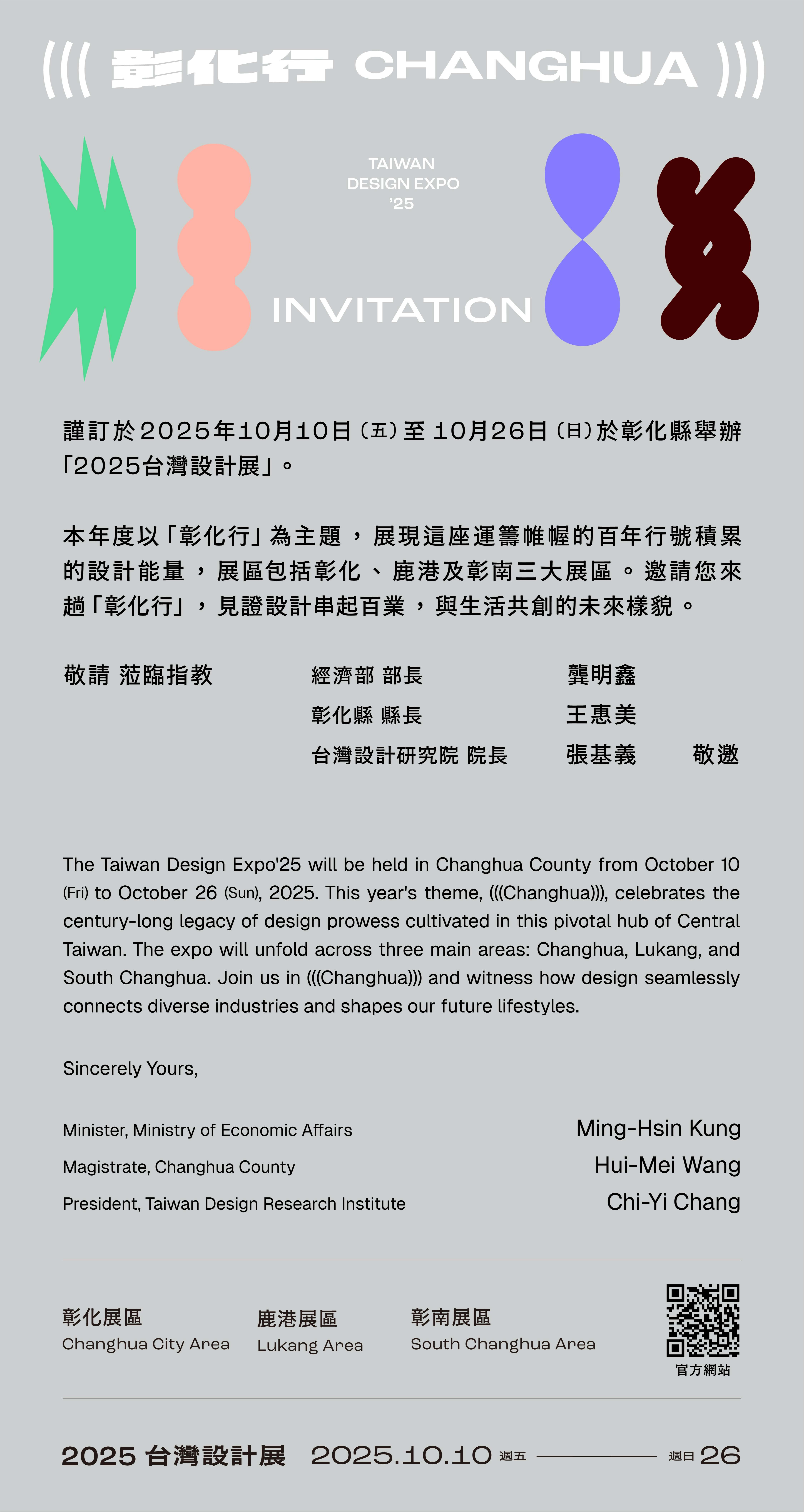 一、2025台灣設計展主題為「彰化行 (((CHANGHUA)))」,由設計師聶永真操刀,匯聚700位設計師、1,640家廠商及600家在地店家參與,展覽橫跨彰化、鹿港、田中、田尾等地,規劃三大展區與15個主題展,完整呈現彰化的產業、文化與創意。展區參觀時間為每日上午10點至下午6時,週五週六延長至晚間8點。