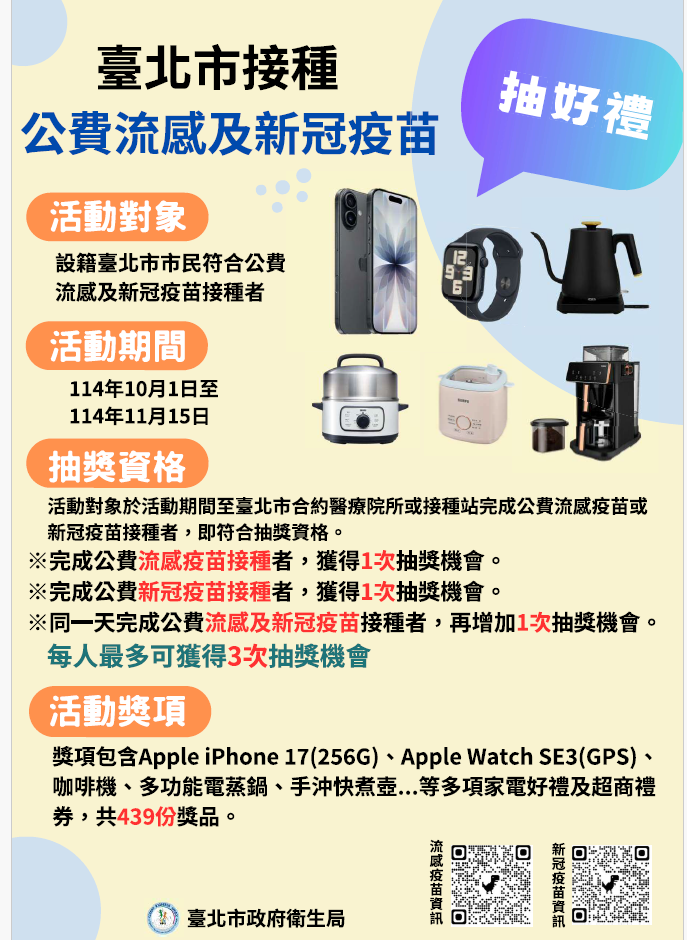 設籍臺北市市民符合公費流感及新冠疫苗接種者於114年10月1日至11月15日期間,於臺北市合約醫療院所或接種站完成公費流感疫苗或新冠疫苗接種者,即符合抽獎資格。