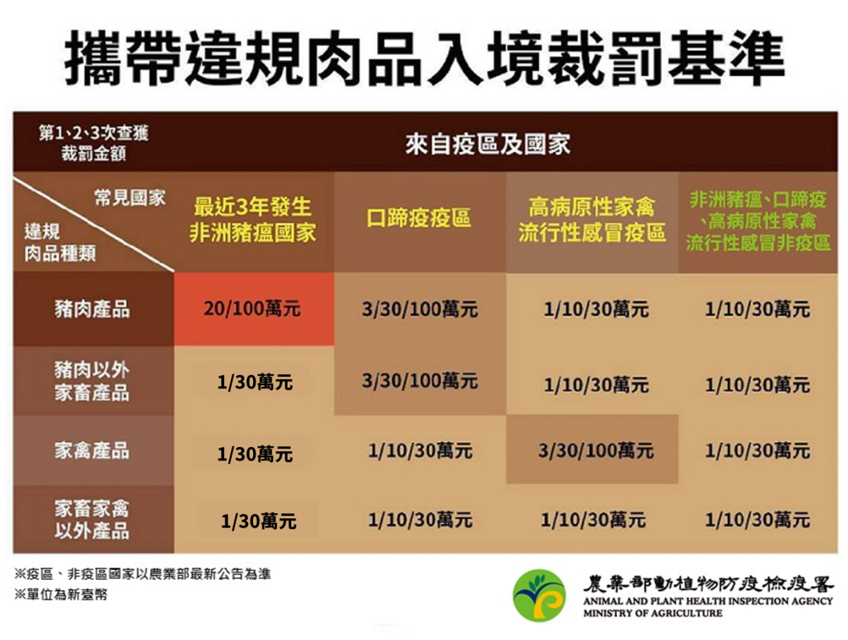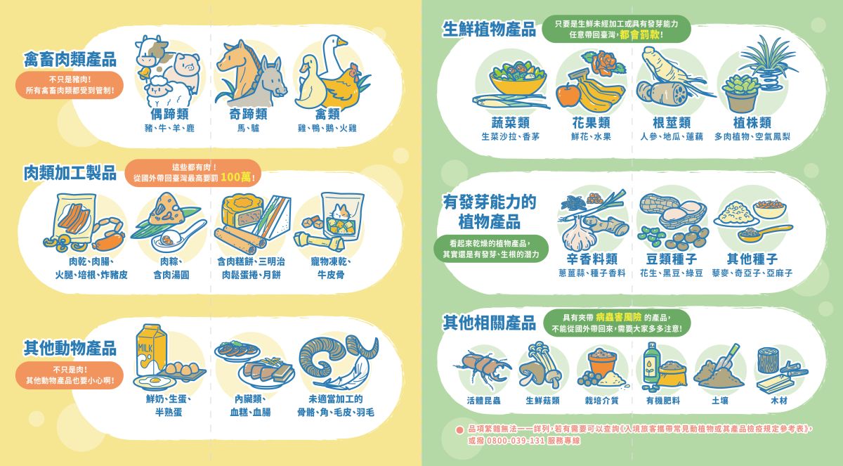 三、該部業於114年1月13日以臺教綜(五)字第1140003985號 函(諒達),轉知農業部動植物防疫檢疫署來文表示,經統計113年國人違規攜帶動物檢疫物案件,以自中國大陸、 香港、越南、日本、澳門及新加坡返國者較多,常見違規輸入動物產品,有肉鬆蛋捲、火腿腸、香腸、鳳爪、肉 乾、半熟蛋、雞鴨鵝肉製品及含肉飛機餐等,爰請貴校向 教職員工生進行宣導,入境時勿攜帶動植物檢疫物,並請 轉知國外親友,勿郵寄豬肉產品等動物檢疫物到臺灣,以免受罰。為因應前揭疫情之應變措施,請貴校再加強宣導本事項。