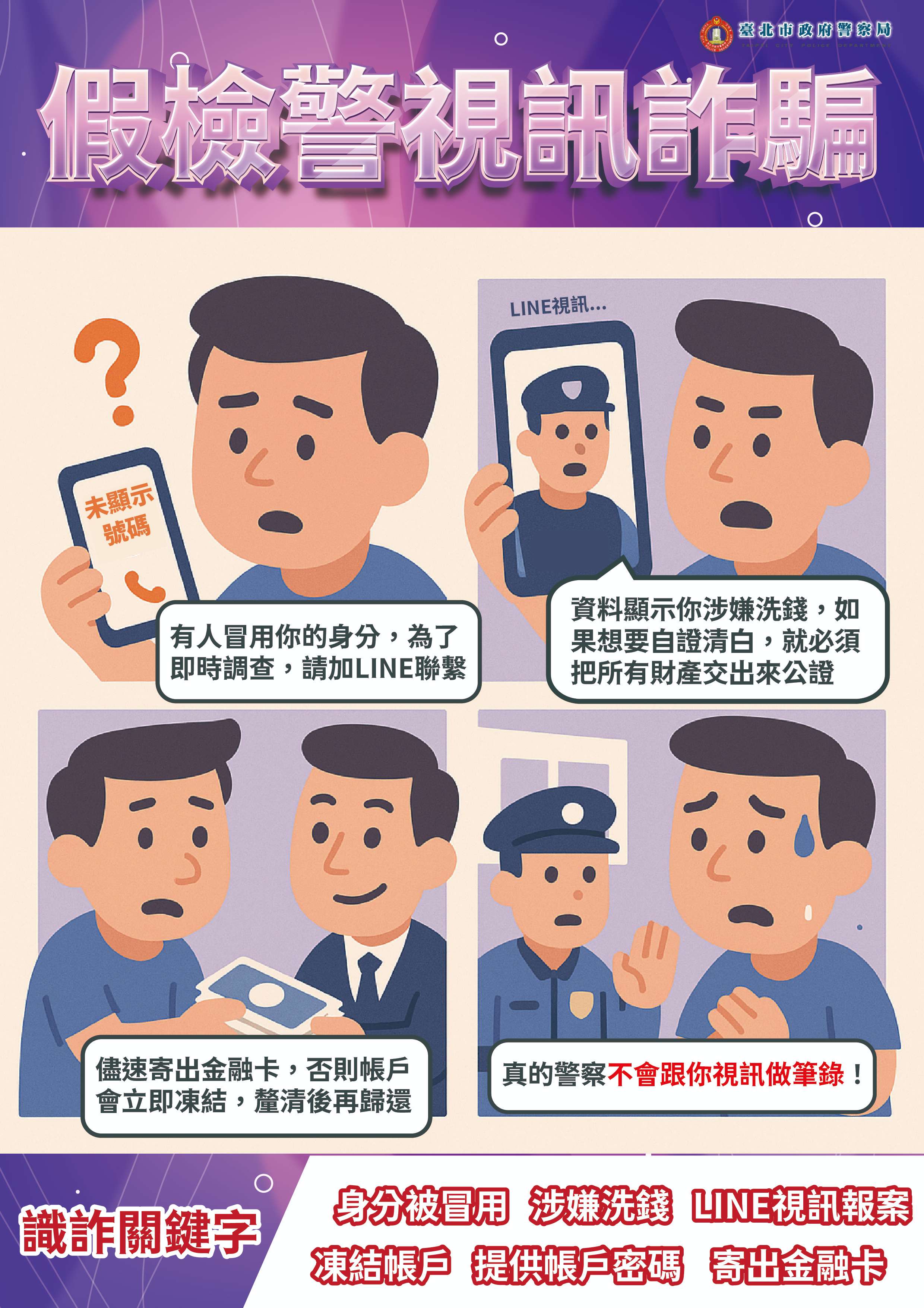 三、近期發現詐騙集團常用「假檢警視訊」、「二次詐騙」等方式,誘導民眾匯款或轉帳,另行政院現正推動「全民普發現金」政策,為避免詐騙集團藉以行騙,警察局彙整宣導圖文素材4張(含114年9月打詐儀錶板數據、4格漫畫案例、宣導傳單)、影片1部,作為10月宣導主軸,以提升識詐宣導廣度。