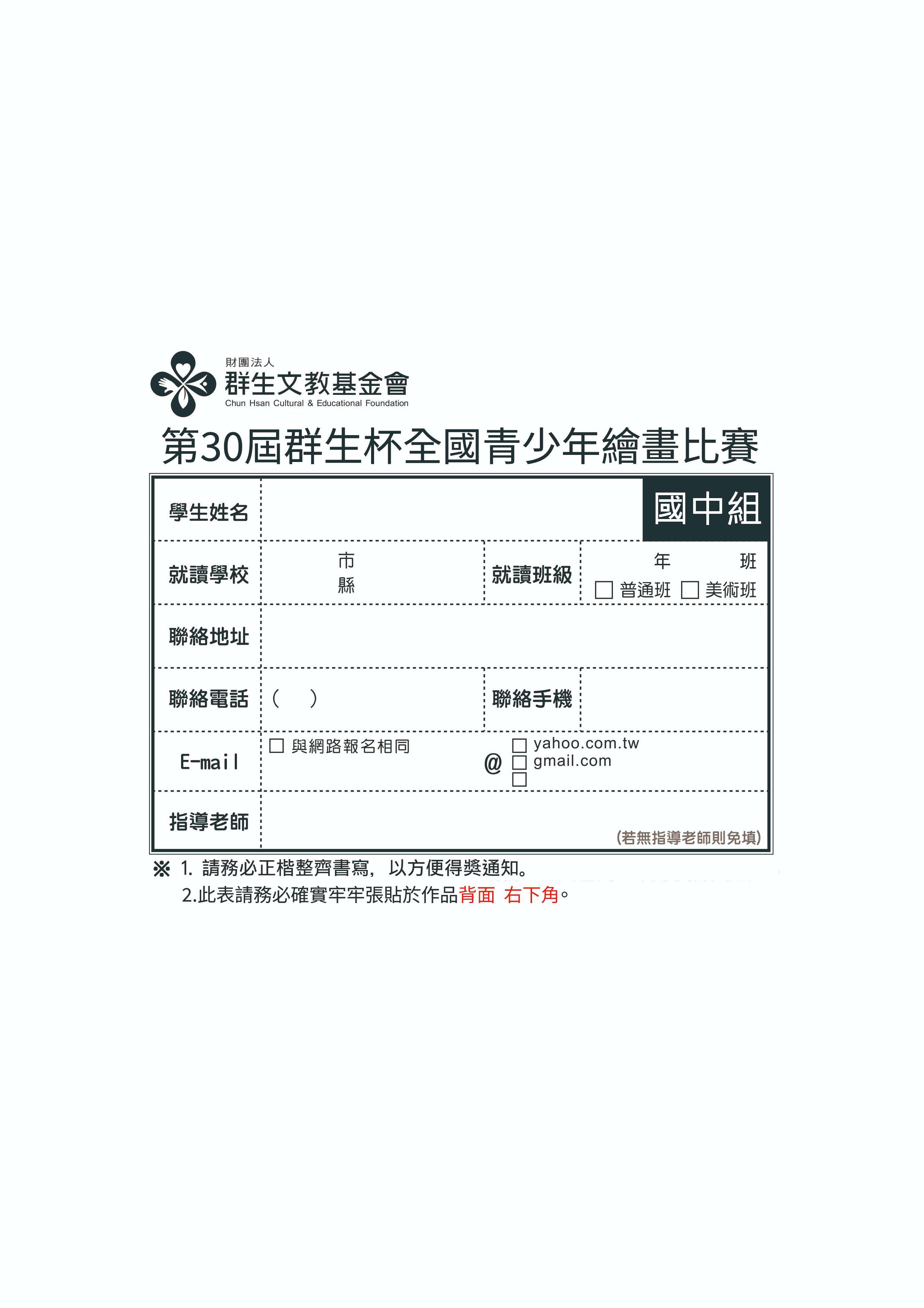 轉知:新北市私立復興高級商工職業學校承辦財團法人群生文教基金會「第30屆群生杯全國青少年繪畫比賽」