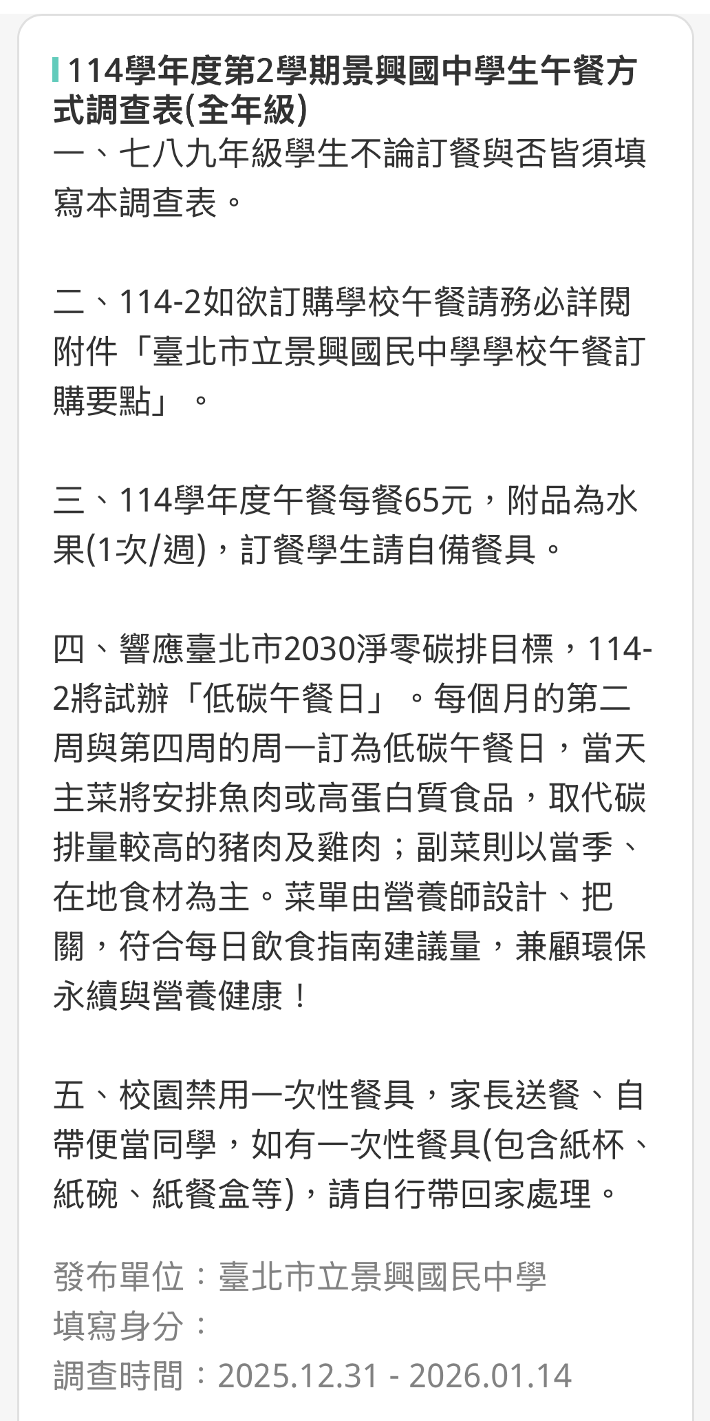 2.如需訂購學校午餐,請參閱附件「臺北市立景興國民中學午餐訂購要點」