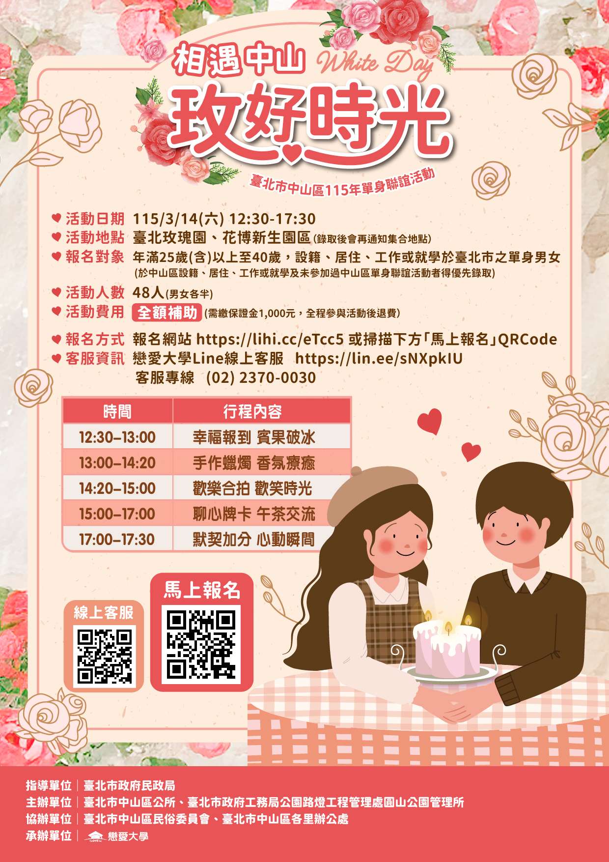 二、臺北市中山區公所『相遇中山 玫好時光』單身聯誼活動,將於115年3月14日(星期六)12時30分至17時30分假臺北玫瑰園及花博新生園區舉辦,活動名額為男、女各24人,共48人,歡迎年齡 25歲以上至40歲於本市設籍、居住、工作或就學之單身者踴躍報名參加(於中山區設籍、居住、工作或就學者及未參加過中山區單身聯誼活動者得優先),活動詳情請參閱本所官網(https://zsdo.gov. taipei/)或電洽(02)25031369分機593鍾小姐。