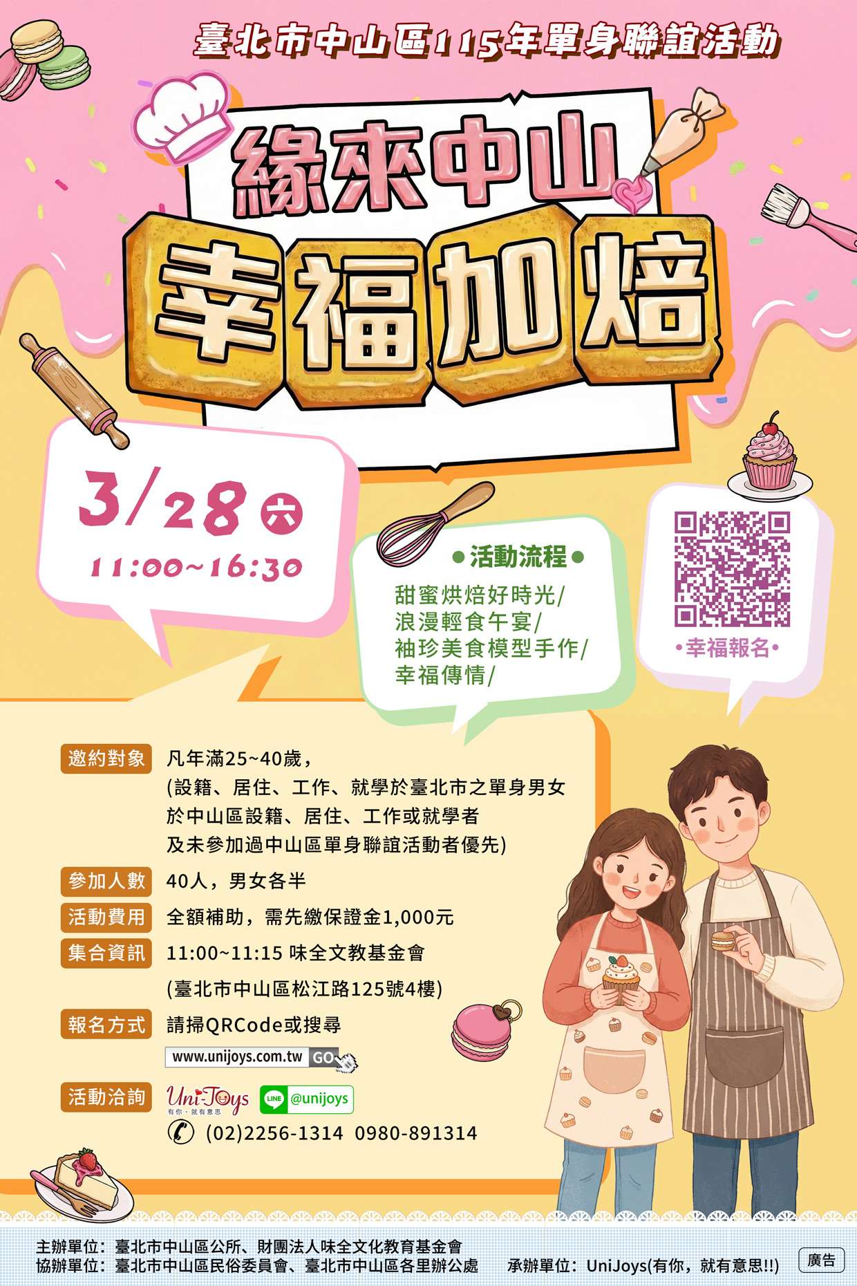 二、臺北市中山區公所『緣來中山 幸福加焙』單身聯誼活動,將於115年3月28日(星期六)11時至16時30分假味全文教基金會舉辦,活動名額為男、女各20人,共40人,歡迎年齡25歲以上至40歲於本市設籍、居住、工作或就學之單身者踴躍報名參加(於中山區設籍、居住、工作或就學者及未參加過中山區單身聯誼活動者得優先),活動詳情請參閱區公所官網(https://zsdo. gov. taipei/)或電洽(02)25031369分機593鍾小姐。