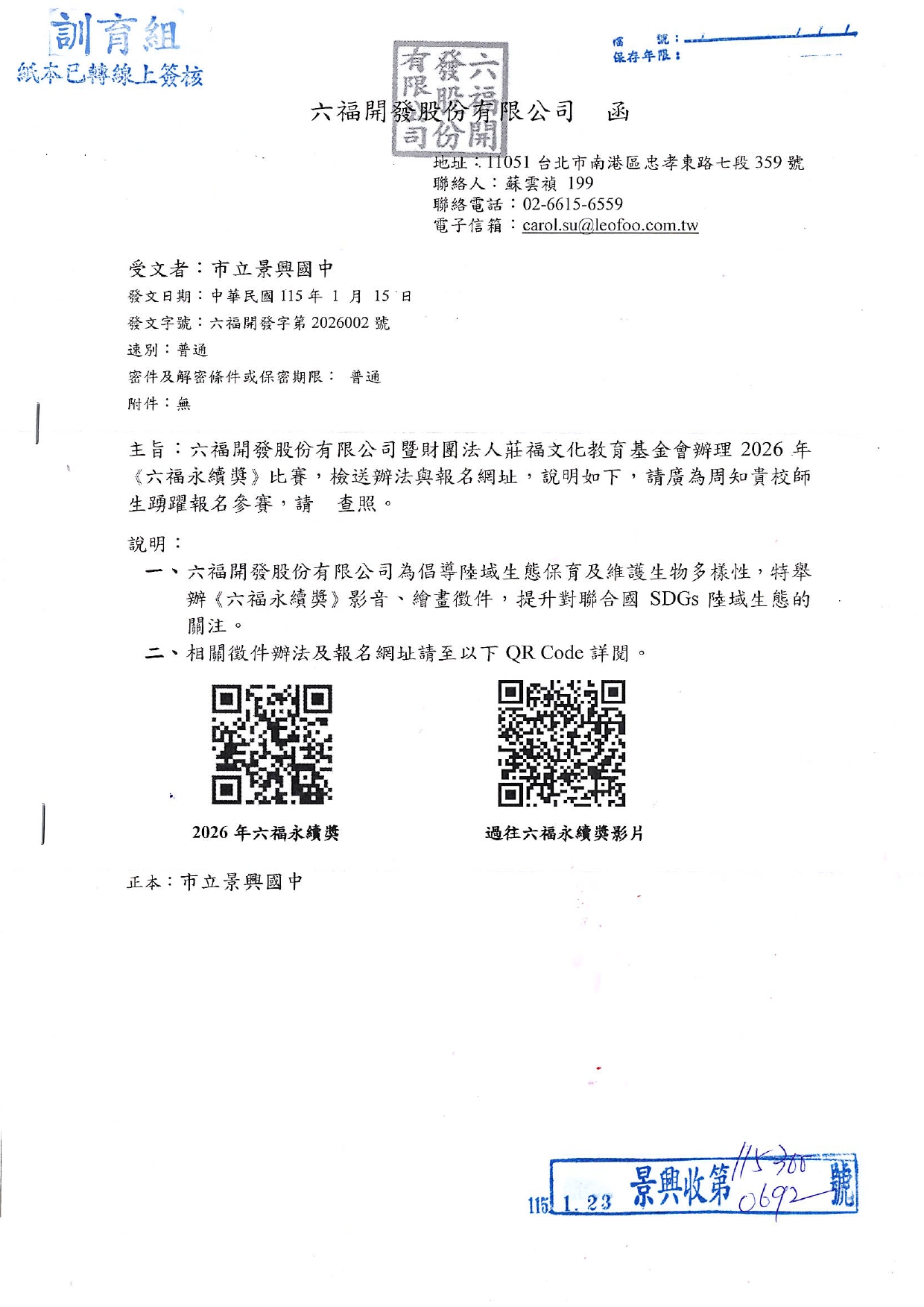 轉知:六福開發股份有限公司暨財團法人莊福文化教育基金會辦理2026年六福永續獎比賽