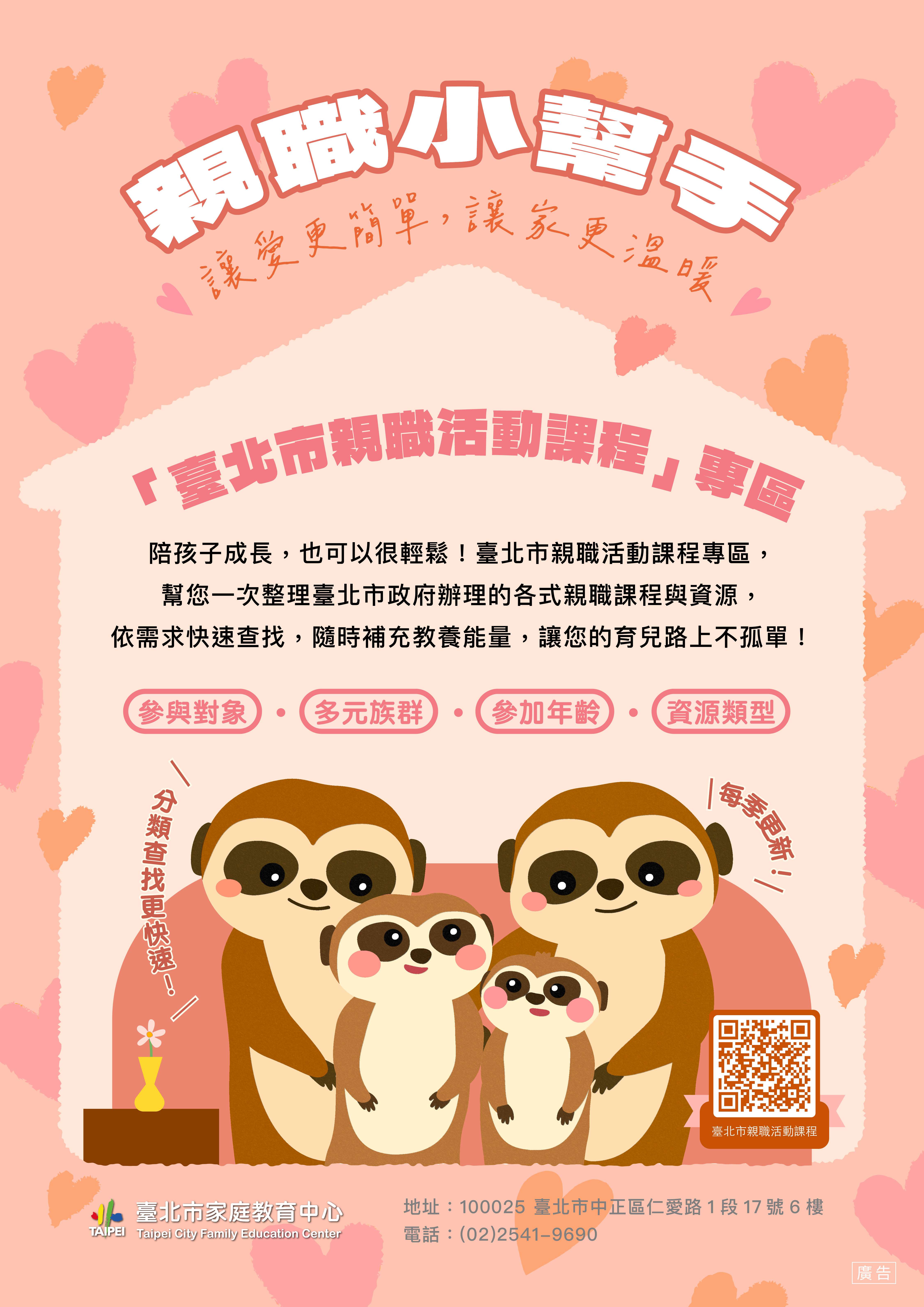 為協助家長掌握親職教育資源,臺北市家庭教育中心設置「臺北市親職活動課程專區」,每季更新臺北市政府辦理之親職課程與活動,並依參與對象與資源類型等分類,歡迎家長掃描QR Code查詢。
