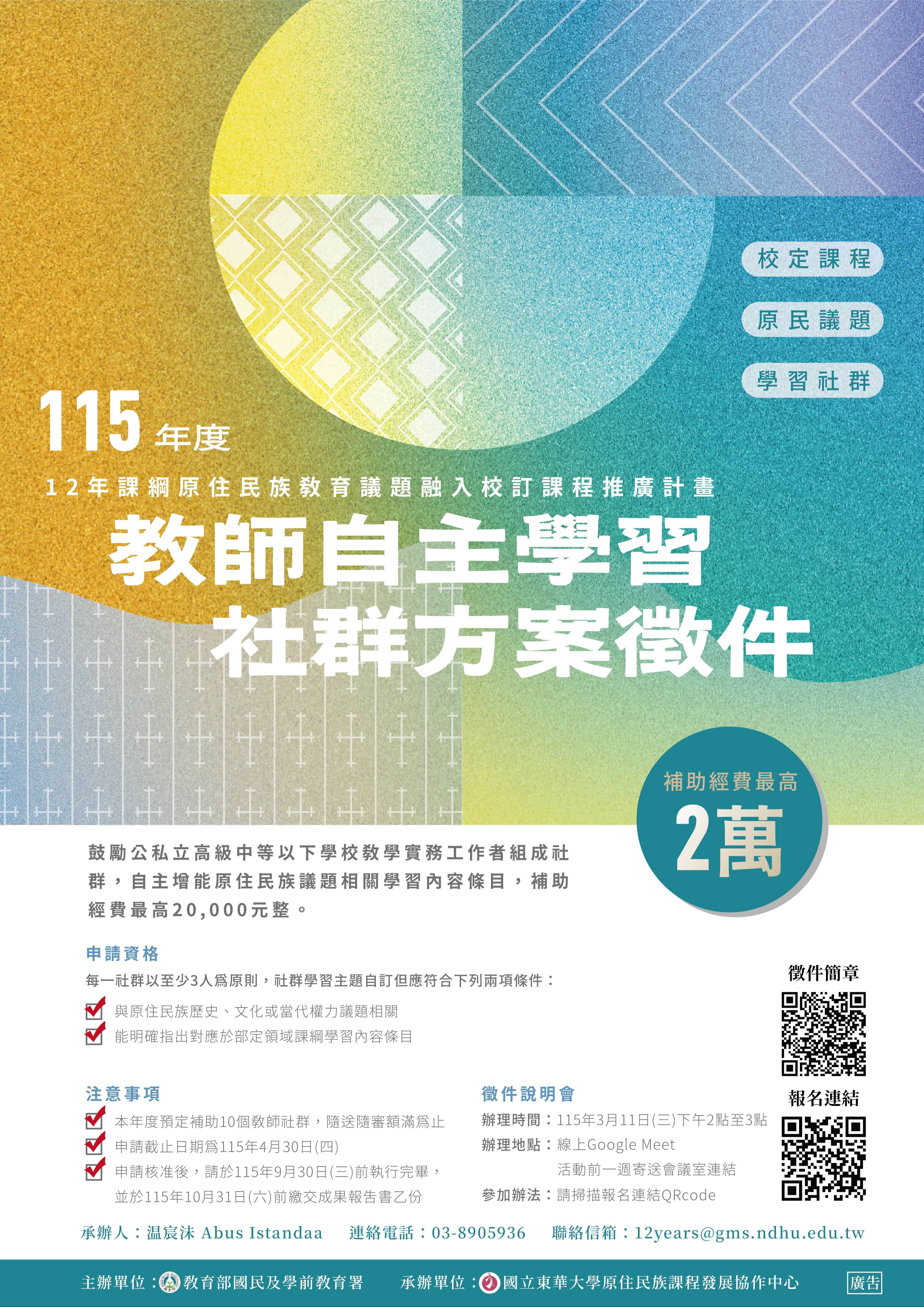 二、因應十二年國教課綱正式實施,為協助教師及學校落實原住民族議題融入各學習領域及課程,爰辦理旨揭方案,補助教師組成學習社群,進行相關學習內容之自主增能,以提升教師對原住民族教育議題之理解,並推動全民原住民族教育理念之落實。