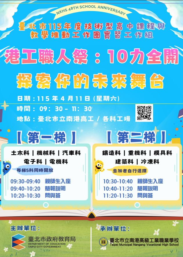 臺北市立南港高工辦理「港工職人祭:10力全開,探索你的未來舞台」參訪座談會,敬邀貴校老師、學生及家長踴躍參與。