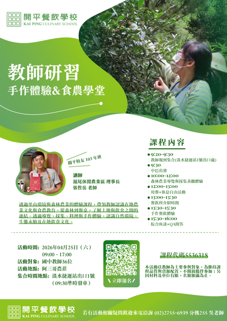 轉知:(教師研習)開平餐飲學校手作體驗&食農學堂