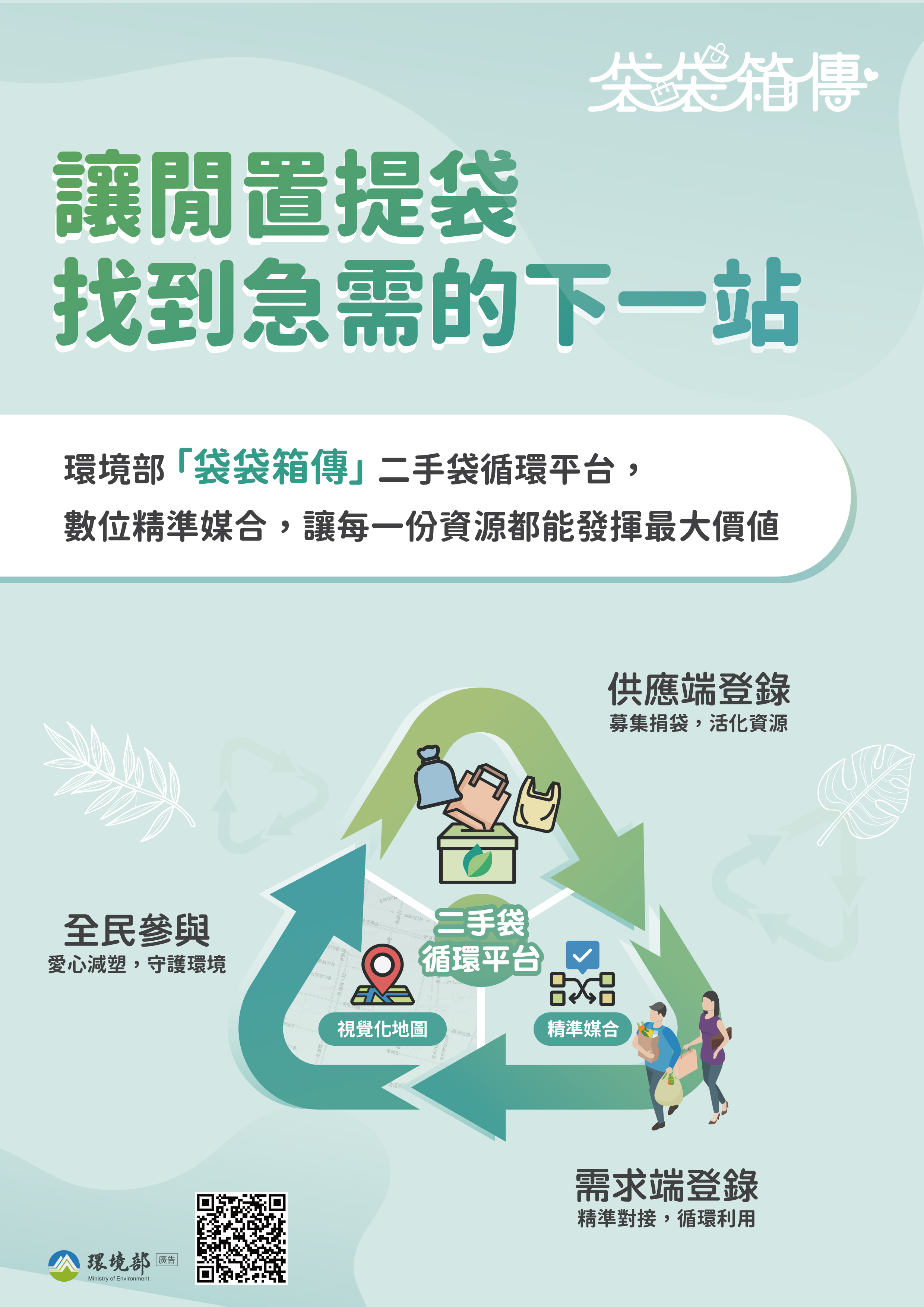 一、為因應全球原物料及環境的挑戰,環境部建置「袋袋箱傳」二手袋循環平台(https://sup.moenv.gov.tw/Page/rebag),期公私協力透過該平台連結可提供二手袋的企業與需要二手袋的商家,讓二手紙袋及購物袋循環流動,實現「減廢、省錢、護地球」的共贏生活圈。